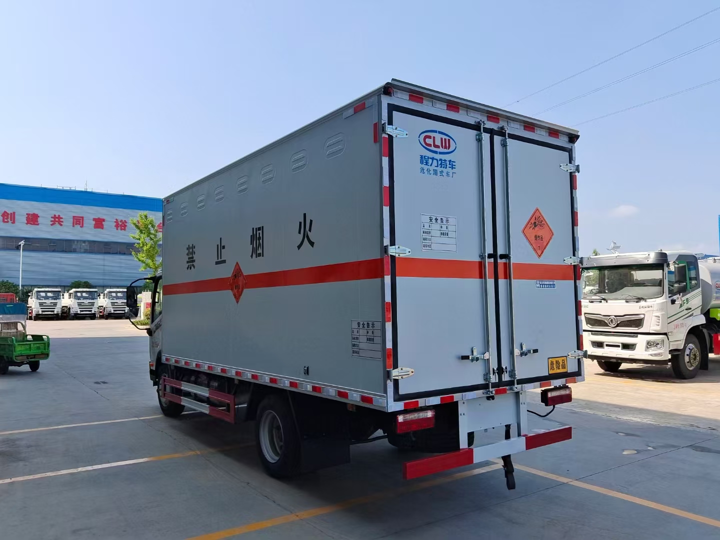 | 貨箱配置 | 廂體為雙層金屬骨架結構,外板采用冷軋鋼板,中間填充阻燃泡沫,內飾為鋁板。底板為平板上鋪防靜電膠皮。廂內兩側加裝固定貨物臥環,門框帶防盜報警器,頂部帶煙霧報警器,廂體右側選裝側門,隨車配2個滅火器,危險標志牌,防火帽,危險品三角頂燈。 (尾部可選裝液壓升降尾板) | ||