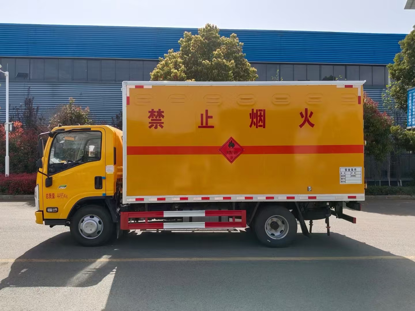 | 貨箱配置 | 廂體為雙層金屬骨架結(jié)構(gòu),外板采用冷軋鋼板,中間填充阻燃泡沫,內(nèi)飾為鋁板。底板為平板上鋪防靜電膠皮。廂內(nèi)兩側(cè)加裝固定貨物臥環(huán),門框帶防盜報警器,頂部帶煙霧報警器,廂體右側(cè)選裝側(cè)門,隨車配2個滅火器,危險標志牌,防火帽,危險品三角頂燈。 (選裝瓦楞板貨箱) (尾部可選裝液壓升降尾板) | ||