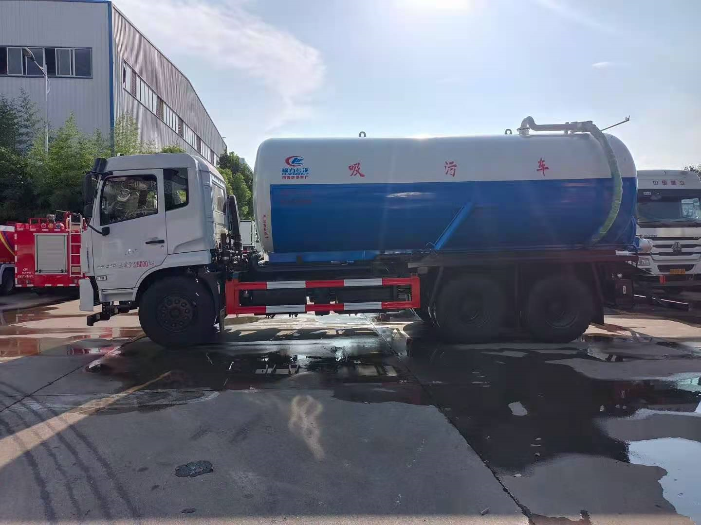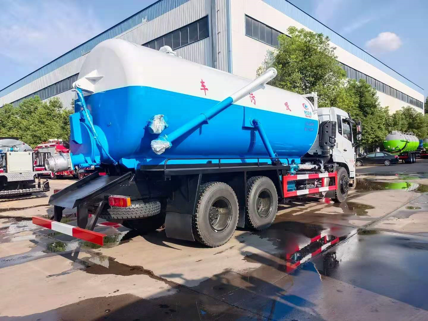 上裝配置 污罐:Q235武鋼6MM厚碳鋼板,標配采用億豐2BE-204水循環泵,防溢閥,視糞管,配一根8米吸污管,罐體封頭一次壓鑄成型、罐體帶舉升,后蓋為液壓開啟。罐內污物可通過后蓋直接傾倒,具有真空度高、噸位大、效率高、用途更廣泛的特點。
