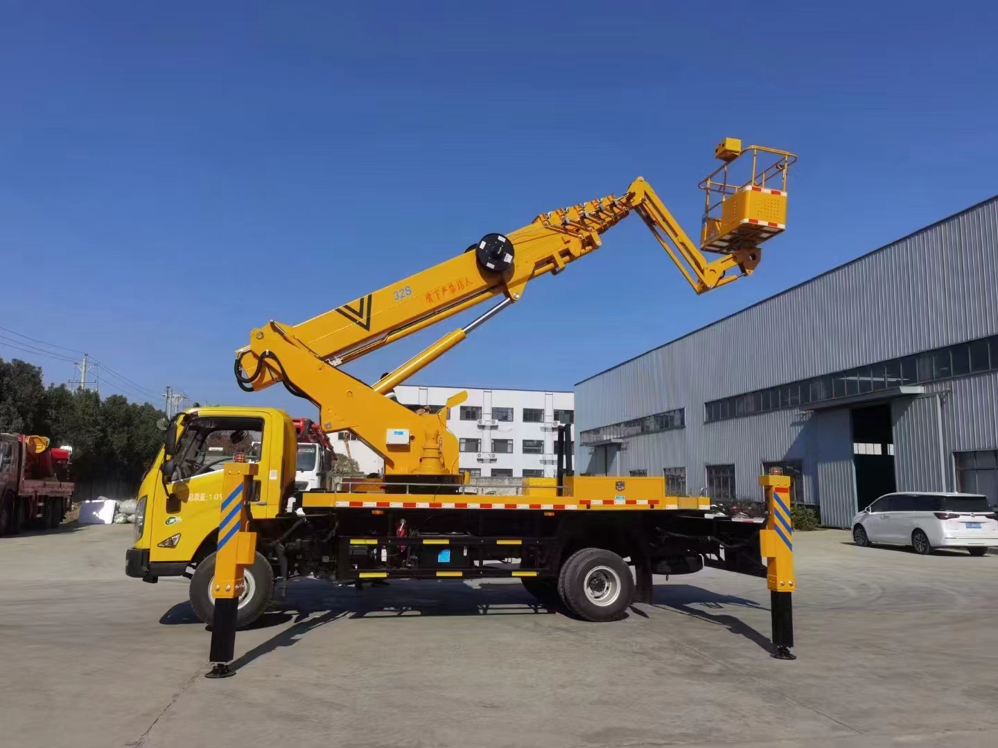 | 上裝配置 | 作業高度32米,帶小飛臂,六節六邊形同步伸縮工作臂,360度連續回轉,配上下車自動互鎖裝置,水平檢測功能,支腿檢測功能,裝有應急電動泵,電液比例控制系統,實現無極調速,液壓自動調平。 | ||
